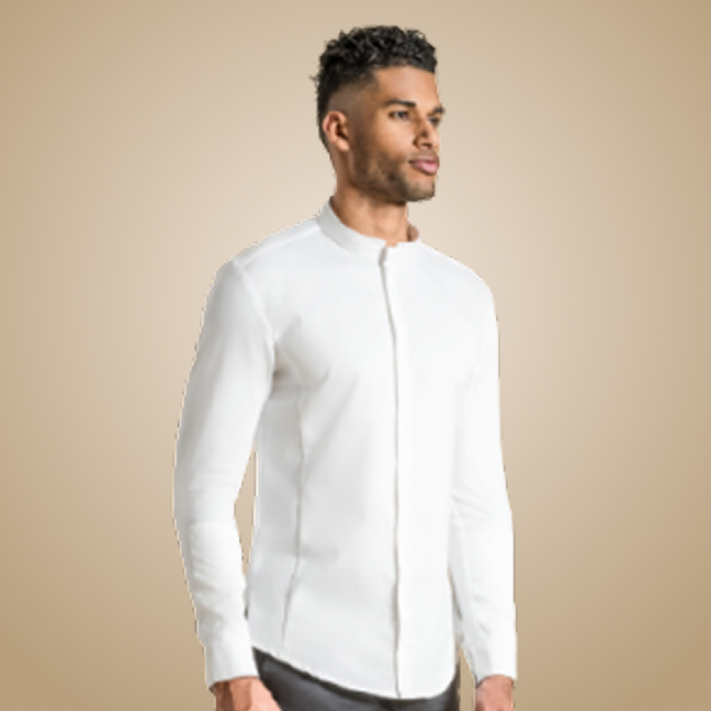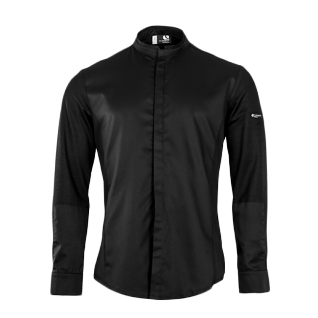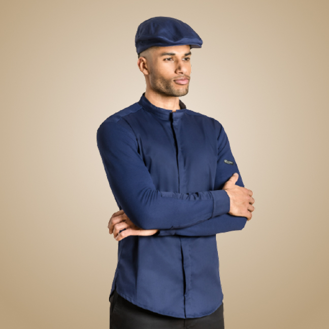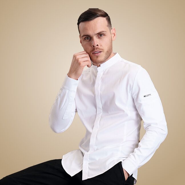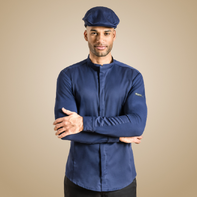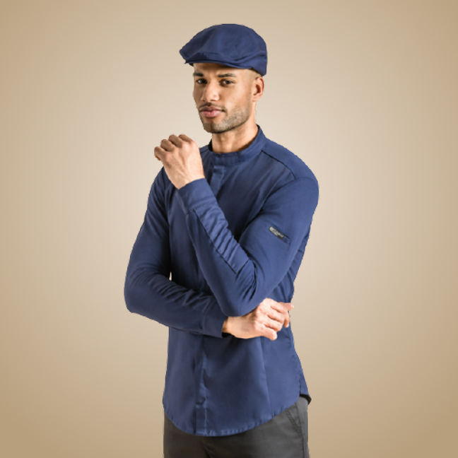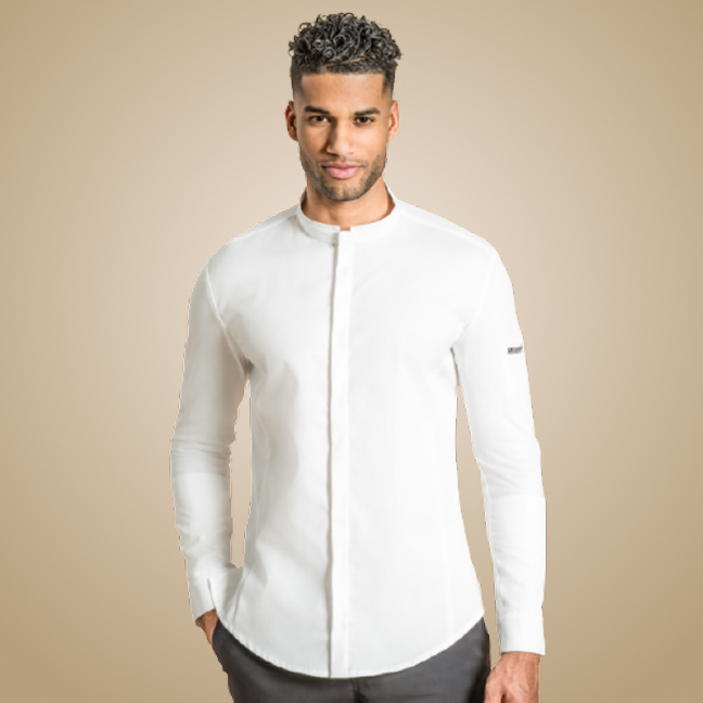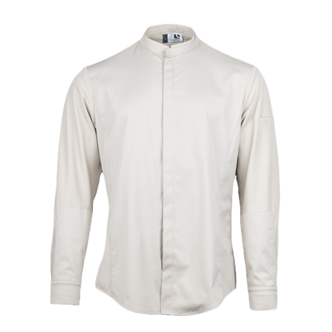 2種のパーツからなるオフィサーカラーとフィット感のあるシルエットが特徴的なキッチンジャケットです。