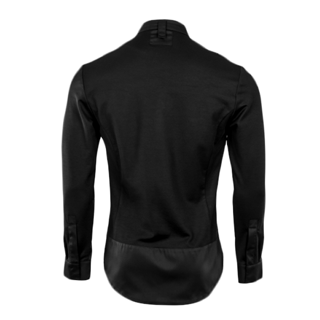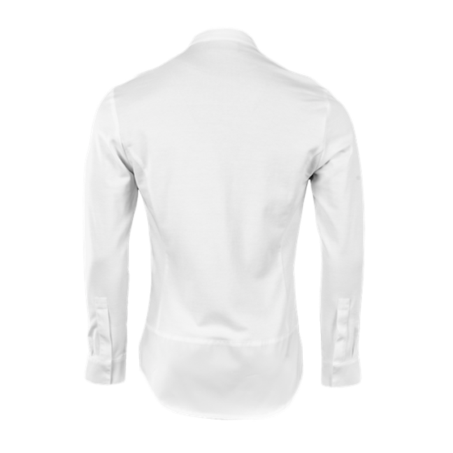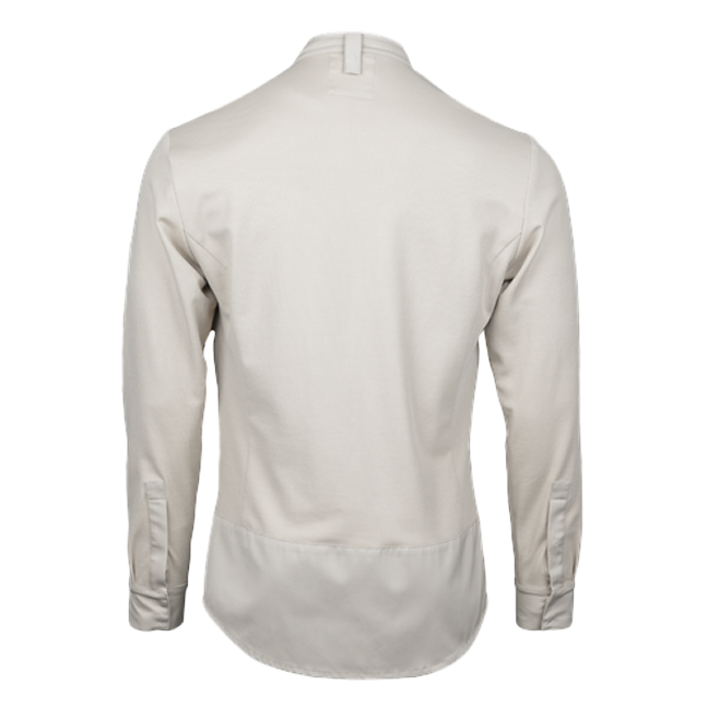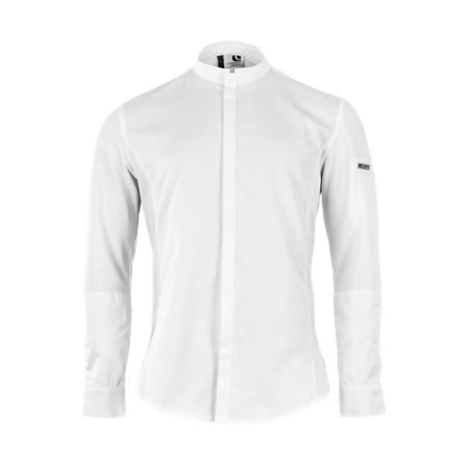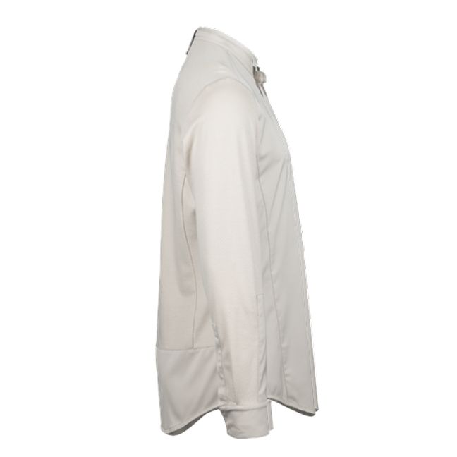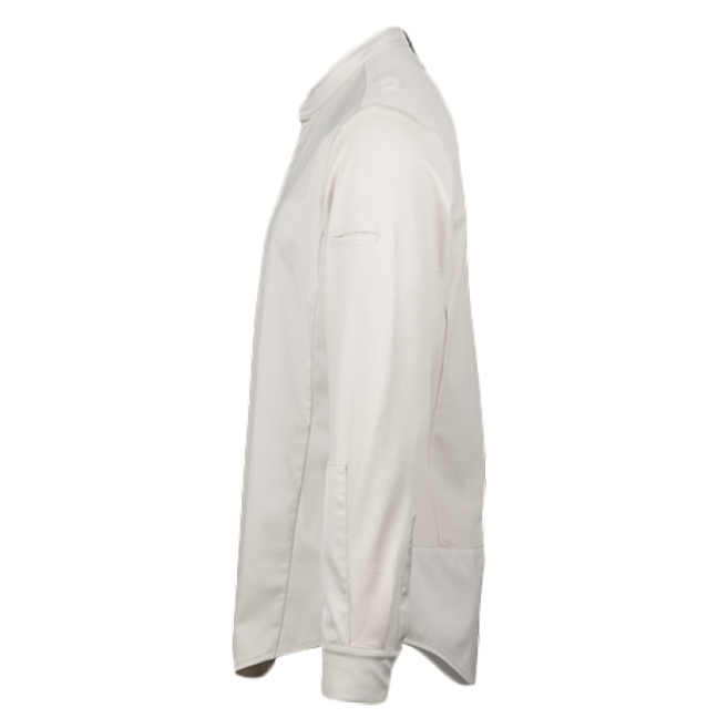 前留めは隠しスナップボタン、通気性を高めるサイドスリット、左袖にはペン差しポケット、背部衿元にはエプロンループを備えています。