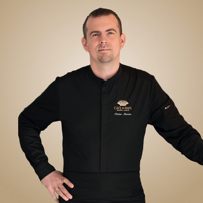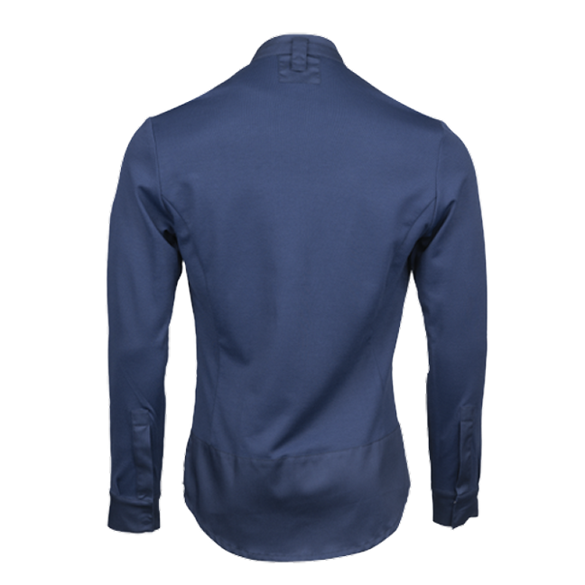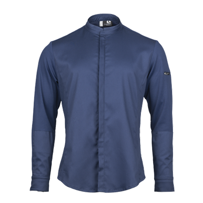 2種のパーツからなるオフィサーカラーとフィット感のあるシルエットが特徴的なキッチンジャケットです。