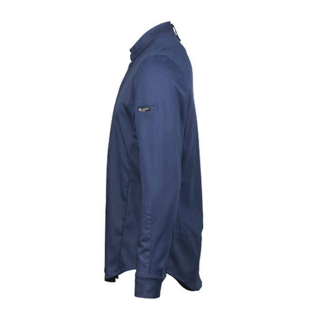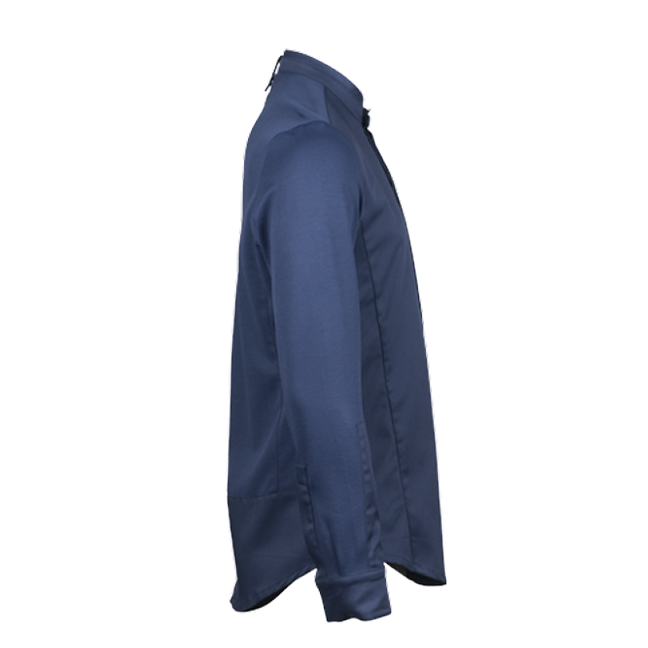 前留めは隠しスナップボタン、通気性を高めるサイドスリット、左袖にはペン差しポケット、背部衿元にはエプロンループを備えています。